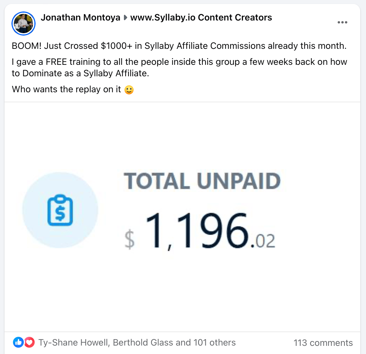 Jonathan Earned $1,196 in 1 Month as a Syllaby Affiliate